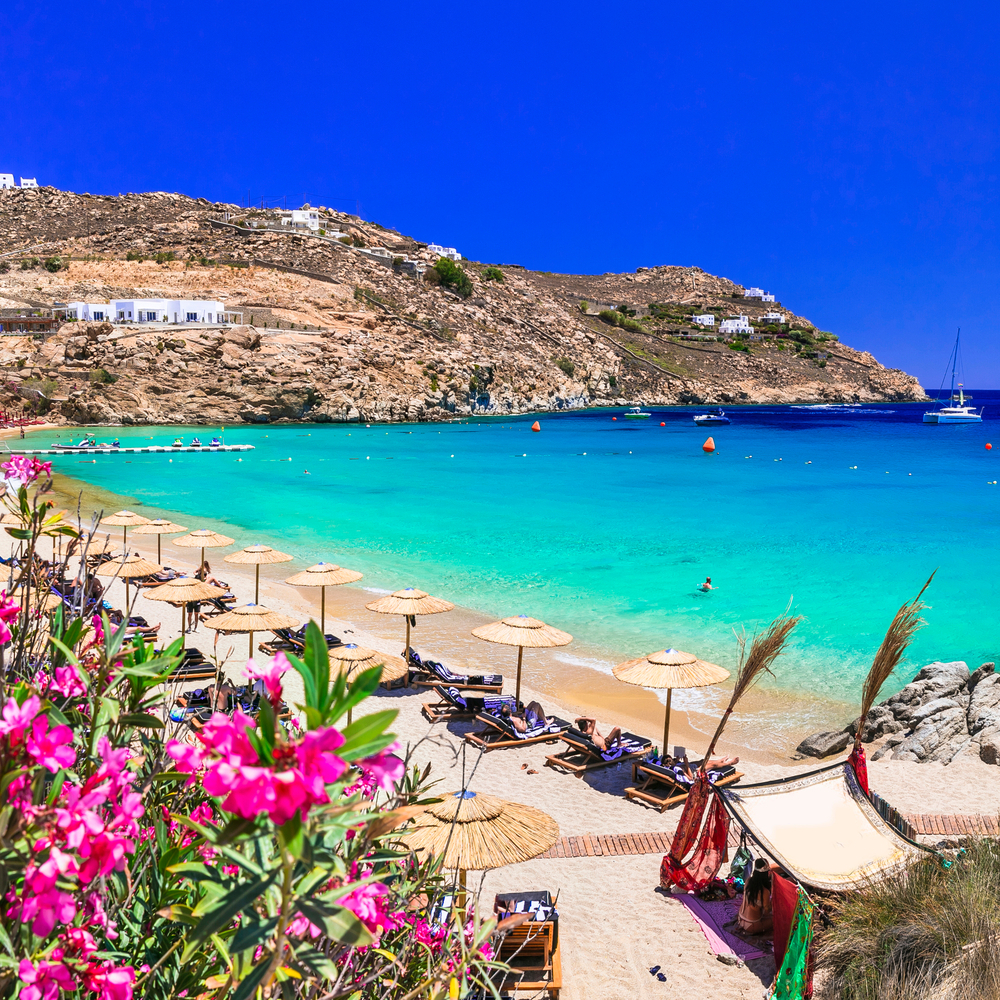 世界十大海灘之一的天堂海灘Paradise Beach擁有潔淨的白色沙灘及無盡遠的藍色海洋文明,許多遊客會在這裡參加各種不同的水上活動,躺在沙灘上進行日光浴或者散步,沙灘旁還有許多富有盛名的酒吧提供各式調酒,讓遊客們都能在這片沙灘上玩得盡興,享受愛琴海的浪漫時光