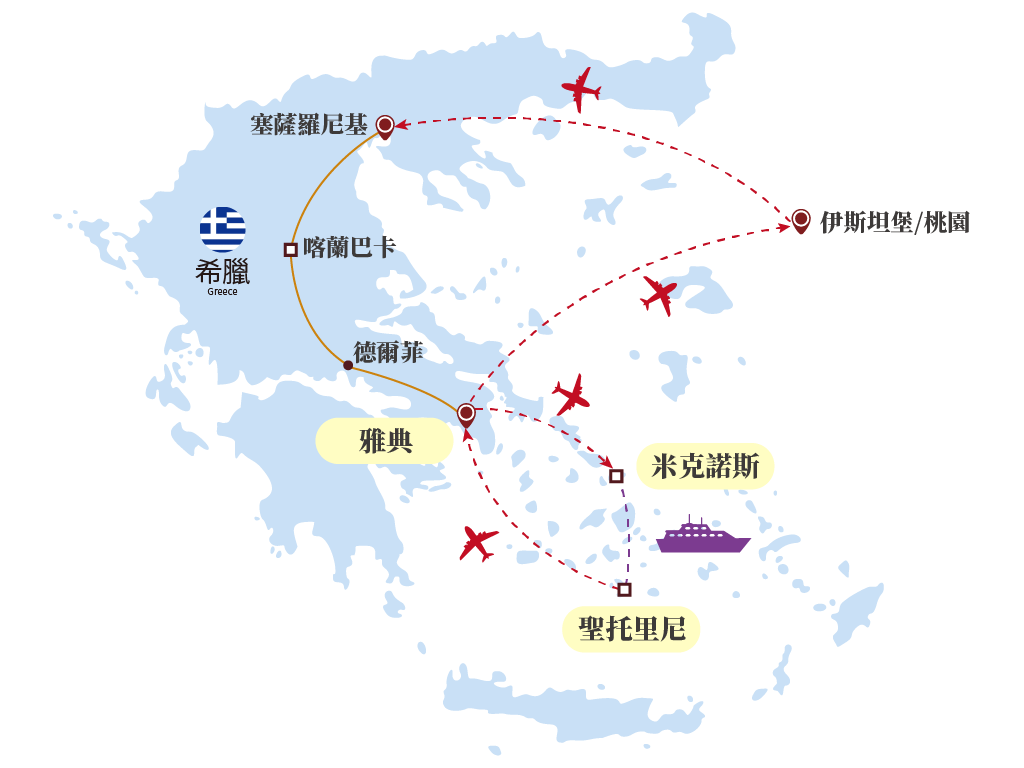 特別安排南北雙點進出,塞薩羅尼基進,雅典出。跟著華友一起節省時間、聰明行程不走回頭路!