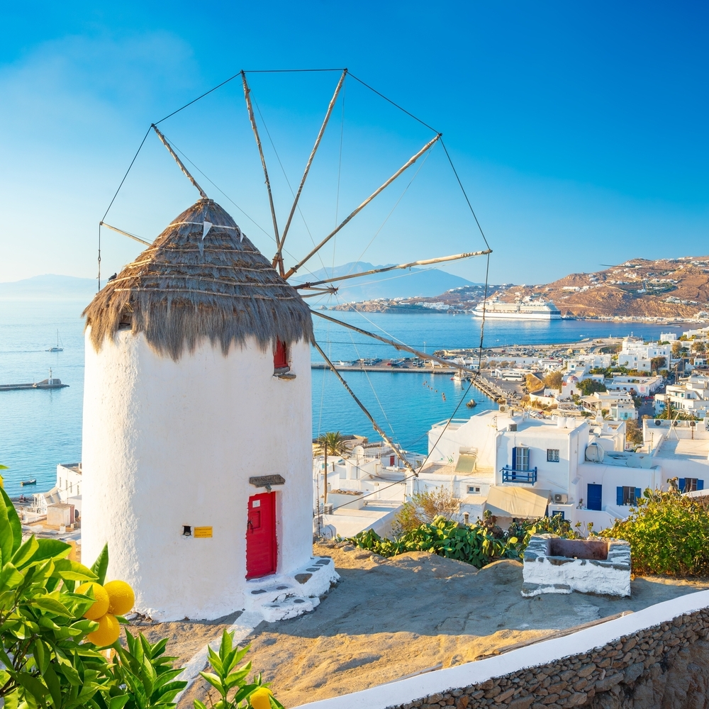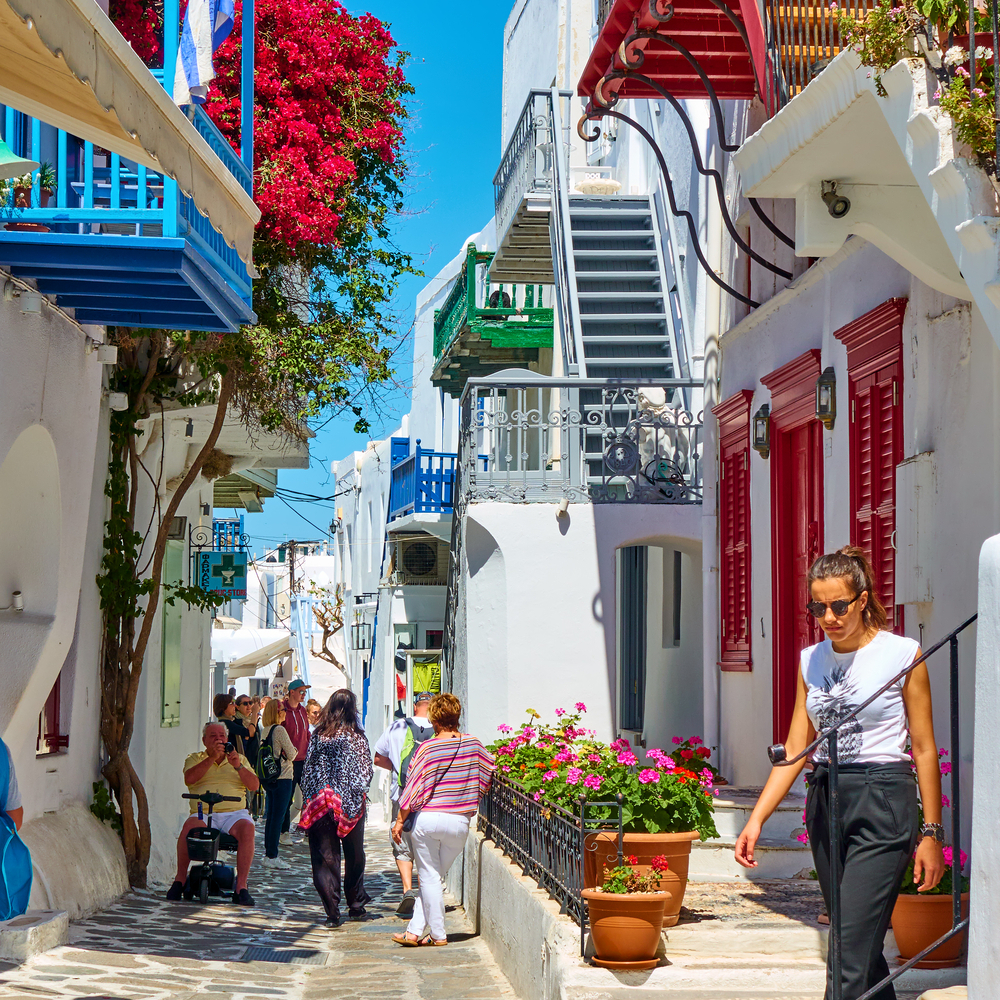米克諾斯以白色建築與海岸景觀聞名,融合悠閒與熱鬧的度假氛圍。