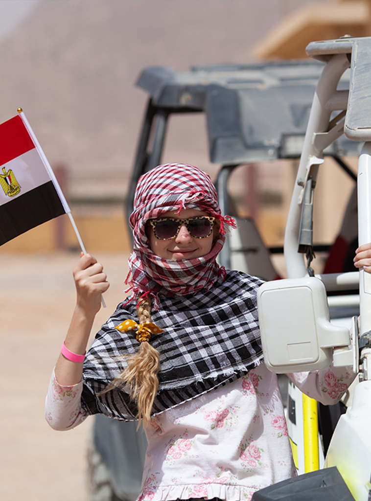 四輪驅動車奔馳於廣瀚沙漠中,隨著沙丘起伏,追逐層層沙浪,領略沙漠民族豪邁氣息;沙漠中海市蜃樓影像,看似咫尺、卻是夢幻!火紅的太陽漸漸消失在地平線上,緊接登場的是那一抹彎彎的月,星星們也一個個探出頭來,而熱情的沙漠部落民族-貝都因村落人們舞動搖擺身軀,讓您沉醉在異國濃厚風情中。