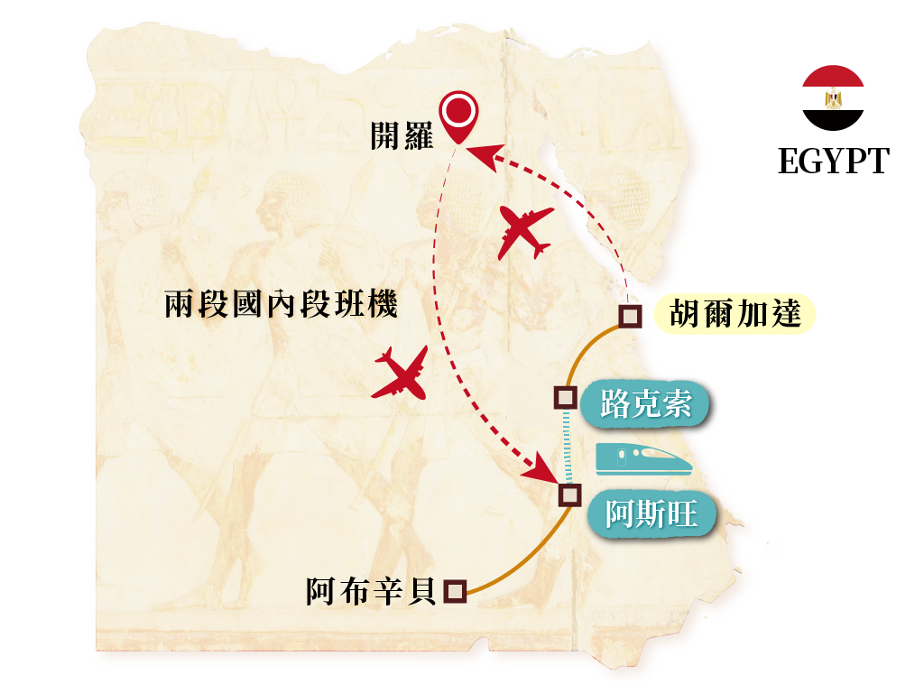 ✦ 全程搭乘兩段國內線飛機,開羅─阿斯旺,胡爾加達─開羅