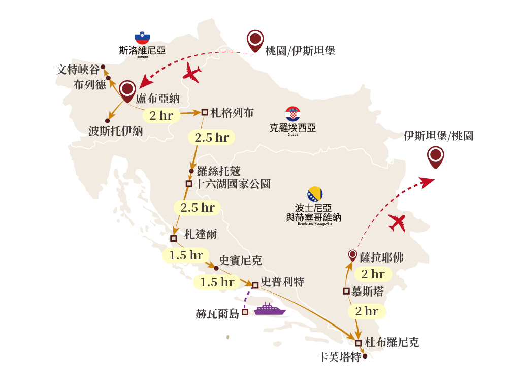 早班機抵達,晚班機離開,旅行時間最滿的 13天 在國家公園入住地區罕見四星,在亞德里亞海岸線三晚海灘五星飯店,最用心的住宿安排 市場最輕鬆順暢的交通安排,每日拉車不超過 2.5小時,時間留給最美的風景 秉持華友的堅持,伴您穿梭克斯波三國,再伴您一同流連忘返