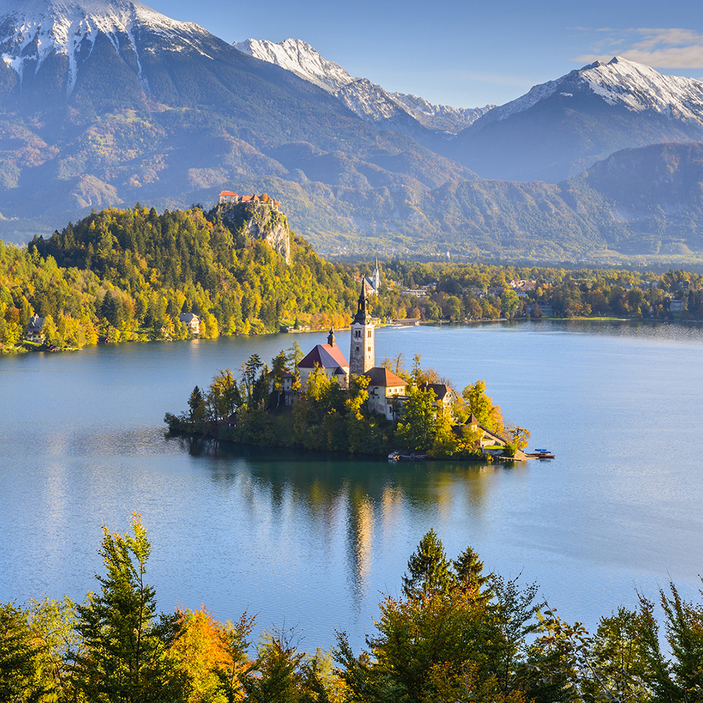 布列德湖位於阿爾卑斯山南麓,湖水呈現清澈的藍綠色,中間有一座小島,搭配遠方雪山與森林,呈現如夢似幻的景色。