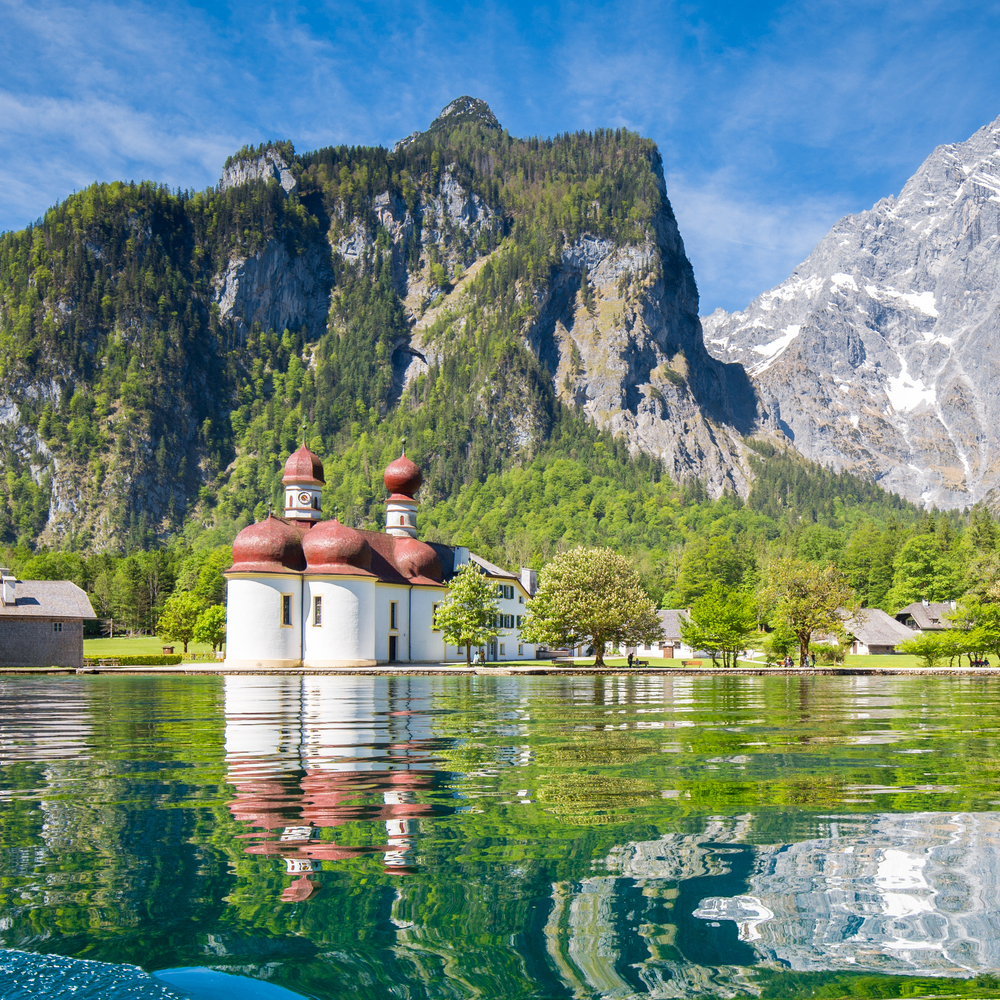 位於德國阿爾卑斯山國家公園內,有著為德國最美麗湖泊美名的國王湖。德國第二高峰瓦茲曼山(Watzmann)蟠臥在湖的西邊,陡峭的岩壁,層層的岩峰,與寶藍色的湖面相得益彰,清靜安然而優雅神秘。我們安排★遊船帶您深入國王湖最經典的旅遊景點:聖巴薩洛馬半島,島上風格獨具特色的聖巴薩洛馬教堂建於十二世紀,洋蔥式的紅瓦屋頂,渾圓的白色身影,襯托在山峰積雪與靛青色的湖水中,更是格外醒目與別緻。