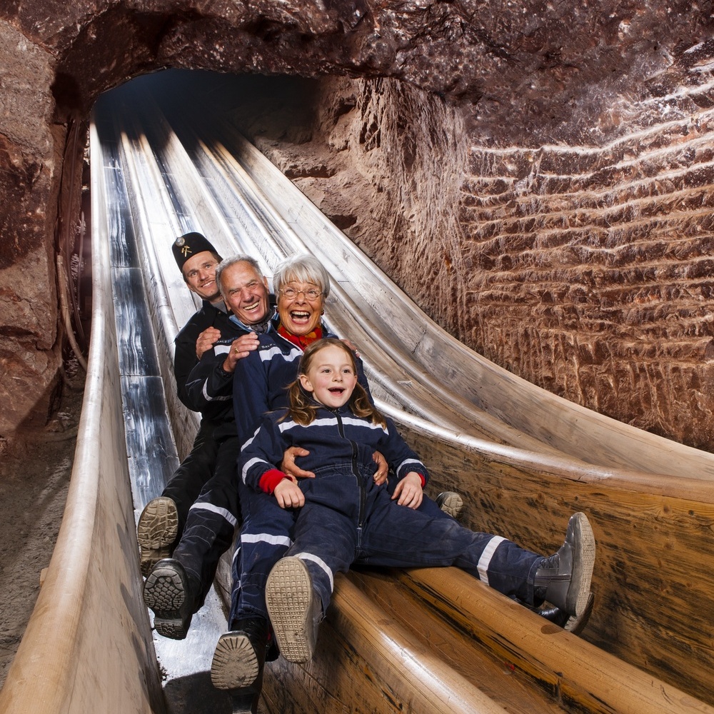 早期因追蹤野鹿深入山中而發現珍貴的岩鹽,後來成為重要的鹽場,如今許多鹽場已經停止採礦作業,轉型成為趣味的觀光景點,深受男女老少的喜愛。我們將會換穿昔日礦工所穿之工作服,搭乘礦區專有的◎鐵軌火車,駛進狹窄而蜿蜒的隧道深處,深入數百公尺的地底鹽場,參觀體驗鹽礦開採的過程,礦坑內保留了幾處昔日礦工方便快速下坑用的狹長◎木滑梯,每位遊客順勢滑入礦坑底層,都是直呼刺激有趣,好玩極了。