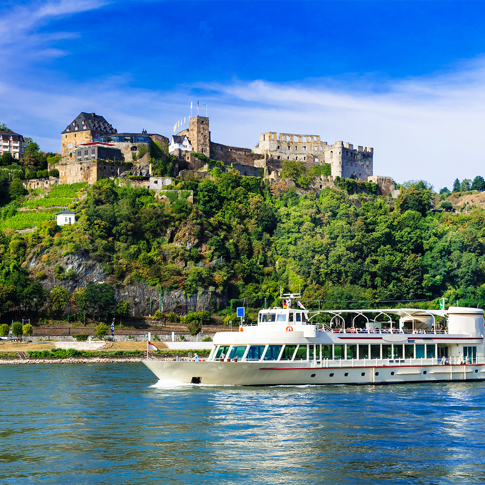 欣賞山崖上的座座古堡,沿河遍佈風光秀美的小鎮,萊茵河在此繪製出蕩氣迴腸的美景,兩岸是高峻的雄偉城堡,種滿山坡的葡萄園,精美可愛的典雅小鎮,羅蕾萊神祕淒美的傳說,讓這段旅途成為最佳的視覺心靈饗宴。萊茵河遊船時,另外安排用心調配的★遊船浪漫咖啡,在暢覽山水名勝的同時,更添詩意。