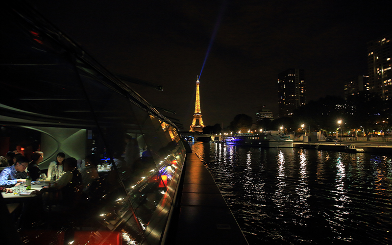 海明威曾說,巴黎是一場流動的饗宴,今晚,我們就安排並於塞納河上享用精緻晚餐,與您一同分享最浪漫情調的夜晚,您可傾聽塞納河流動的樂韻,在瀏覽兩岸雄偉瑰麗的景物時, 您不妨看看河上流淌的倒影,尤其在華燈初上時,塞納河像換上濃妝的貴婦,處處散發著夜巴黎無盡的魅力, 兩岸的建築物和橋樑給璀璨的燈光裝飾得美輪美奐,使澄藍的塞納河上閃亮著交錯的燈影,如虛如幻般於水面建構另一個迷人都會。