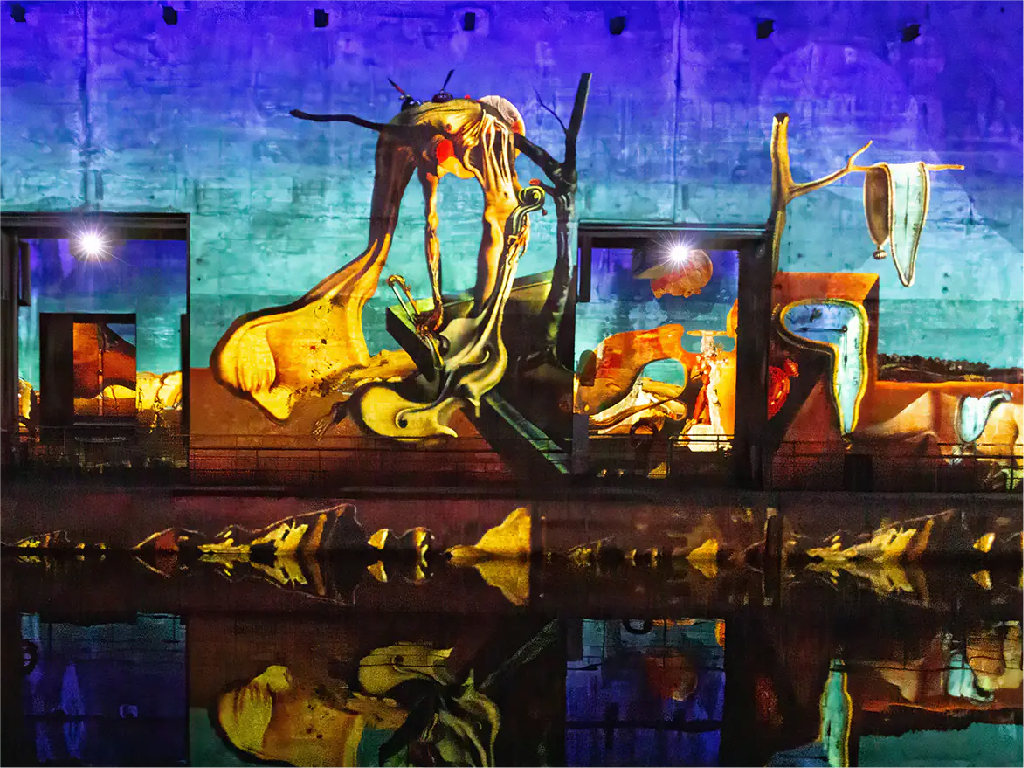 二戰時期的潛水艇基地,在2020年轉型為藝術展覽空間,投影在堅硬牆面上的光影畫面搭配震撼磅礴的音效,水塘鏡射出的光影,為整個展示添增不同的景緻與氛圍,讓觀眾就在動態之中,讓精神隨意漫遊流淌其中。