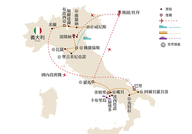 15天走遍托斯卡尼區域、水都威尼斯、米蘭、馬特拉、蘑菇村、南義區域和羅馬,行程具有最大的豐富度。