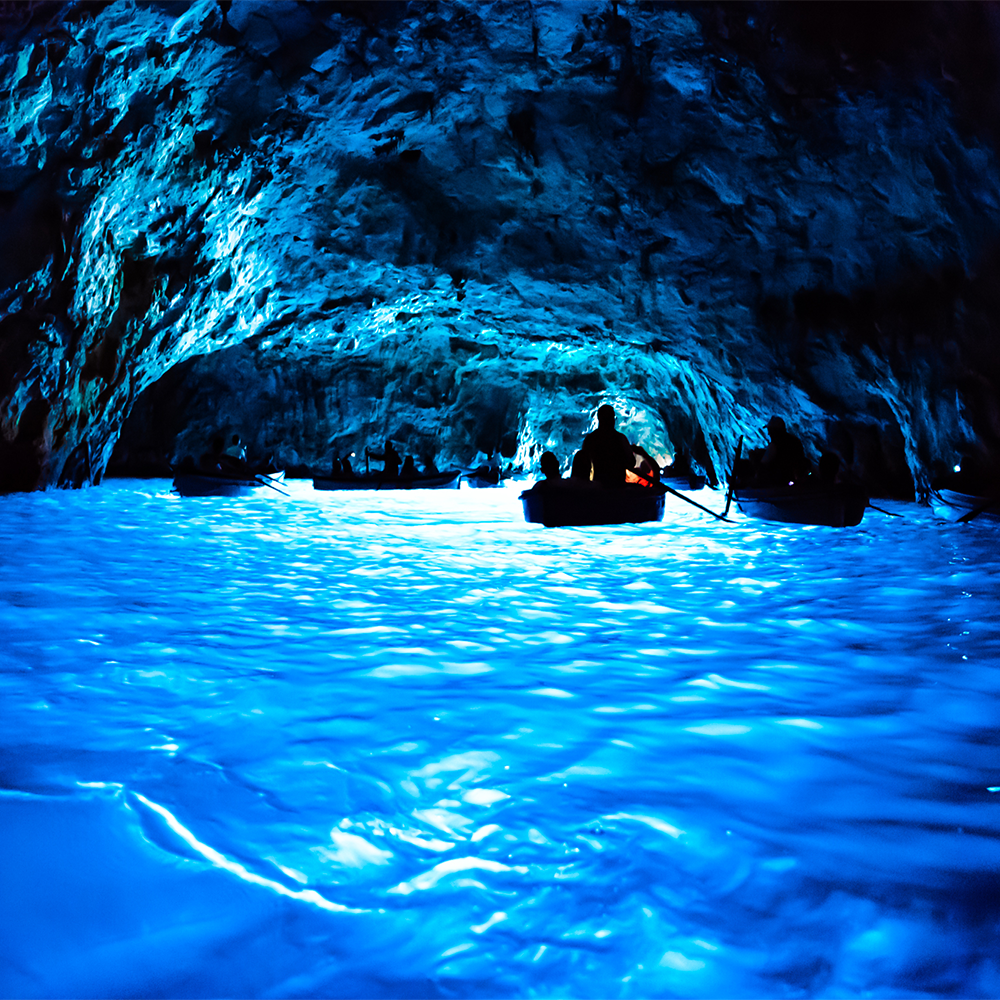 抵達卡布里島大港口之後,若海象許可,我們將換乘✭快船前往著名的『藍洞』。藍洞是一個長約53公尺,寬約30公尺,高約15公尺的海蝕洞。我們必須再換乘小船屈著身體進入洞內,體驗曲折的光線將海水變為如夢如幻的深藍世界。