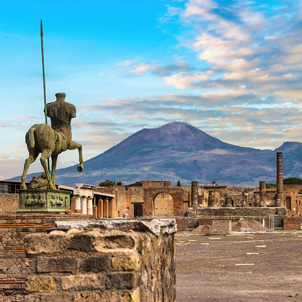 西元79年,因為『維蘇威火山』的爆發,將整座城市埋沒地下兩千年。我們將帶您參觀考古挖掘出土的 ✭龐貝遺跡(安排當地專業導遊解說),輕鬆漫步於市內的街道,瞭解二千年前,富裕的古羅馬市民的生活狀況,以及古代美術的精華,在此還可以遠眺『維蘇威火山』雄壯景觀。