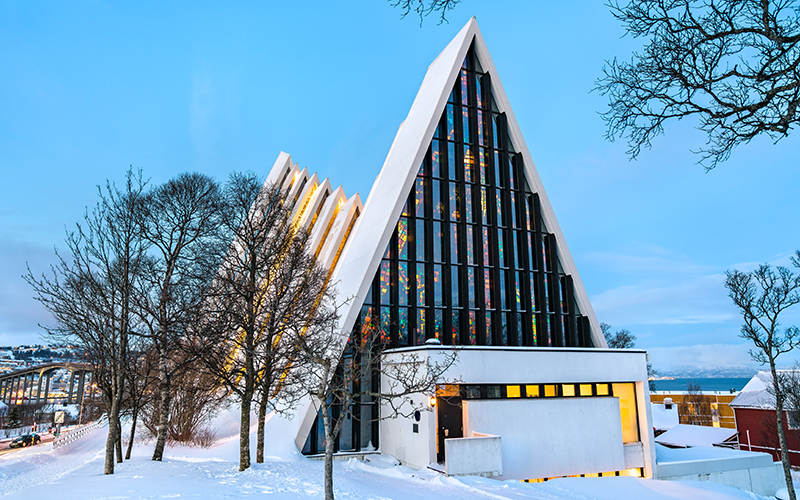 特羅姆瑟最吸睛的地標,建築融合冰山與船屋造型,以 11 塊鋁合金板層疊而成。簡約的北歐線條在雪地中閃耀,如同一座浮在海面上的聖潔冰晶。當冬日陽光灑落,整座建築閃耀著如夢似幻的光澤。