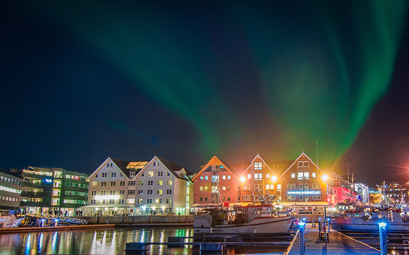 是全球目擊極光機率最高的地點之一。這裡不僅有完善的追光配套,市中心周邊的峽灣與山巒更提供了如夢似幻的構圖背景。