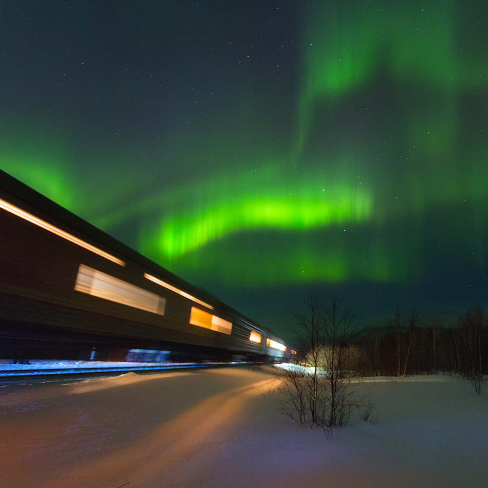 當列車停在靜謐的山嶺之巔,您只需抬頭,便能領略極光劃破黑夜的震撼瞬間。