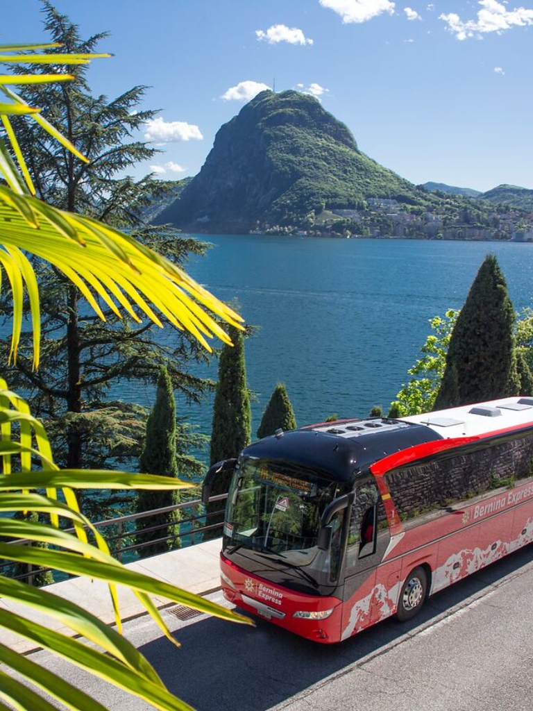 瑞士鐵路環遊唯二的公路路線之一,穿越山谷之際,沿途可見柯莫湖與盧加諾湖,約3小時後抵達地中海氣候的盧加諾,美景令人難忘。