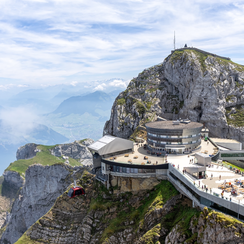 搭乘★琉森湖遊船與全世界最陡峭的★皮拉圖斯齒軌電車上山,可見琉森湖區景緻,到達山頂時,有機會看到少女群峰與德國的黑森林。回程搭乘★大纜車再轉★小纜車,結束空中旅程,隨即回到琉森。